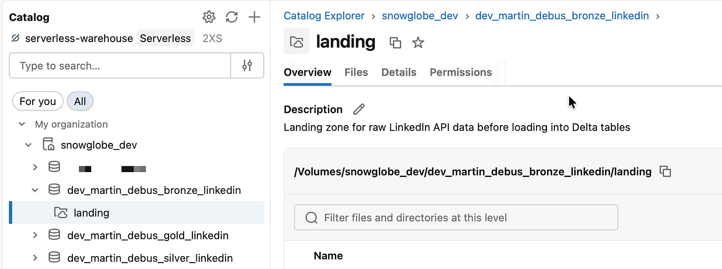 In Part 2 we’ll connect to the LinkedIn API, walking through the API access setup, building the ingest notebook step by step, and wiring it into the bundle as the first job task. By the end of Part 2 you’ll have raw JSON files landing in the Volume you just created.