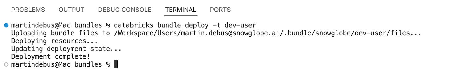 databricks bundle validate --target dev-userDuring deployment, you should see output like: