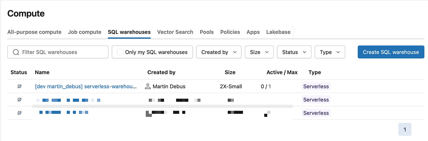 The prefixed shared Serverless SQL Warehouse should appear in the SQL Warehouses section.